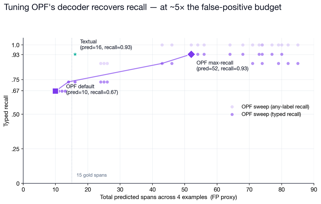 This is consistent with how OpenAI frames the model in their release: Privacy Filter ships with a precision-tuned operating point by design, because over-redaction destroys downstream utility. The model card is explicit that the defaults are conservative and that a Viterbi calibration knob is provided for users who want to tune toward higher recall. We'll come back to that knob in a moment.