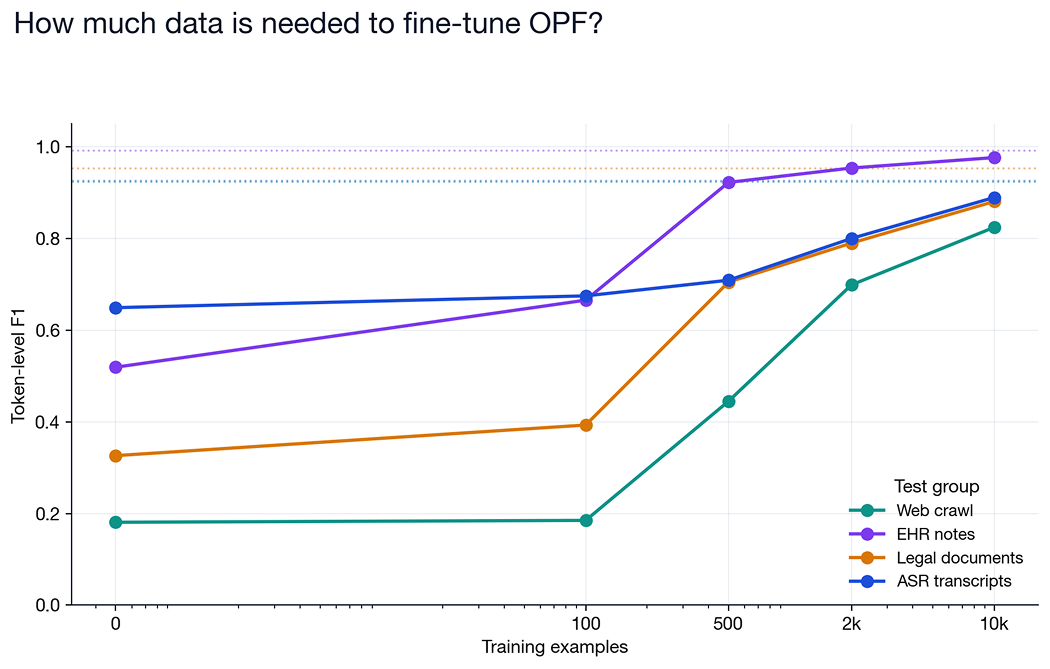 We projected our training artifacts from 26 labels down to OPF's 8-class space, sampled training sets of 100 / 500 / 2k / 10k documents weighted evenly across the four test domains, and fine-tuned the full model on each. Eval is on the same four test groups as the main benchmark.