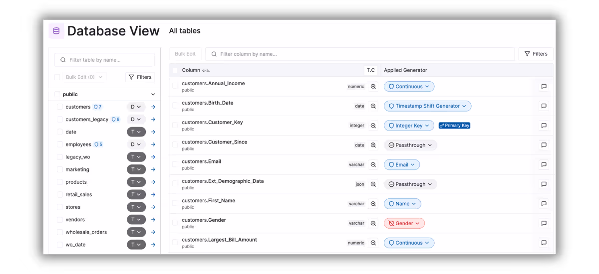 Our database view has a new look designed to make it easier to apply generator suggestions and get to high quality data faster. Check out the Search and Filtering capabilities which now offer more options and are easier to navigate. This update aligns the UI with recent changes we made to Tonic’s Bulk Apply feature to provide a more streamlined workflow for reviewing and configuring generators. Take a look, assign some generators, and let us know what you think!