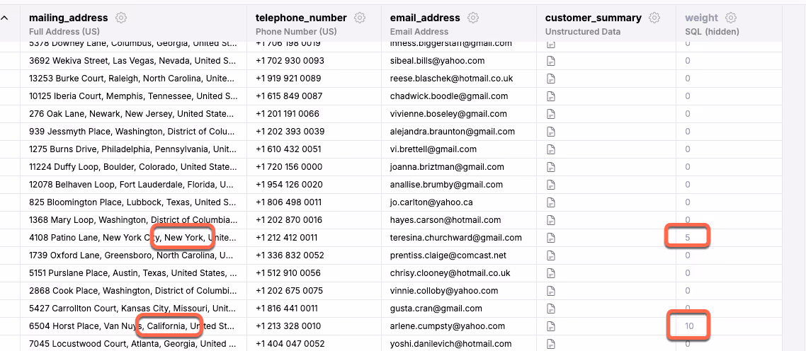 You can see that this is similar to the weight column that we configured for the relative prevalence, and has a similar effect: most customers are from California, fewer are from New York, and no customers are from other states.