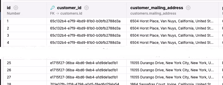 For our example scenario, let's say there are 25 customers in the customers table, and we set Exactly to 5. As a result, each customer is used 5 times, and the orders table contains 125 rows - 5 rows per customer multiplied by 25 customers.