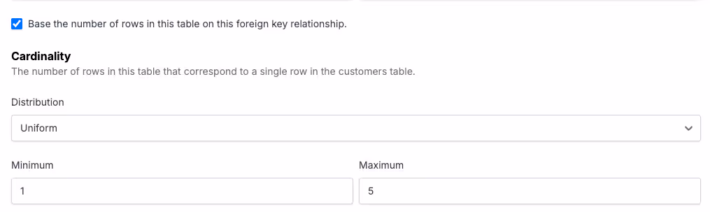 The other way to manage foreign key distribution is to configure the cardinality. The cardinality determines the number of times to use each row from the referenced table.