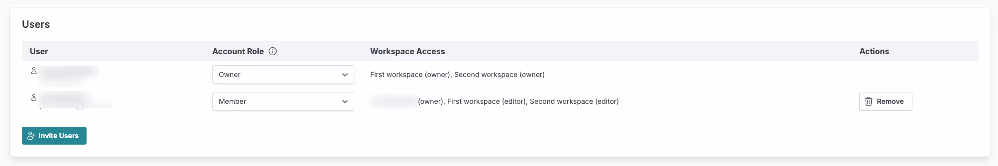Account owners can add users and API keys to the account, and change each user's assigned account role. New users and API keys can be granted access to all of the account workspaces.