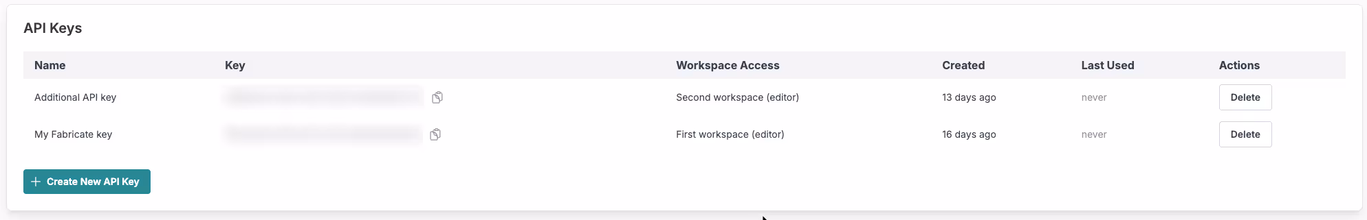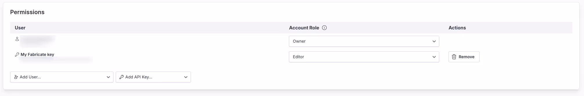 Each Fabricate account represents an organization. A Fabricate account has one or more users and also can have one or more API keys. API keys are used to authenticate Fabricate API requests.