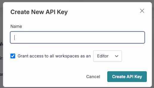 On the New API Key panel, provide a name for the new API key. By default, the new API key is granted editor access to all of the current account workspaces. To not grant any workspace access to the new API key, uncheck the checkbox. You can also select a different workspace role to grant to the API key.
