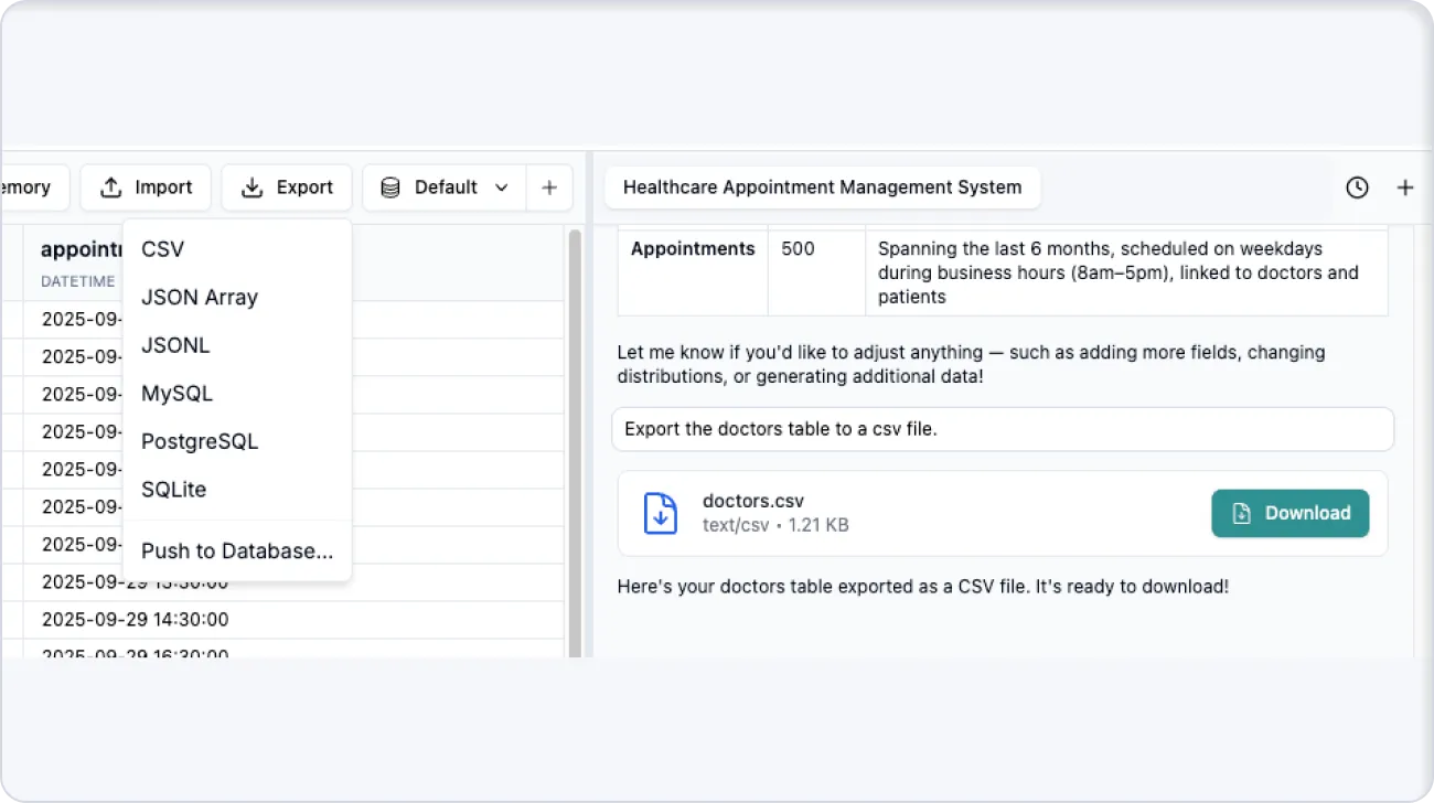 Export your dataset as CSV, JSON, or SQL — ready to drop into your pipeline, test suite, or training workflow. 1,000 rows in under 2 seconds.