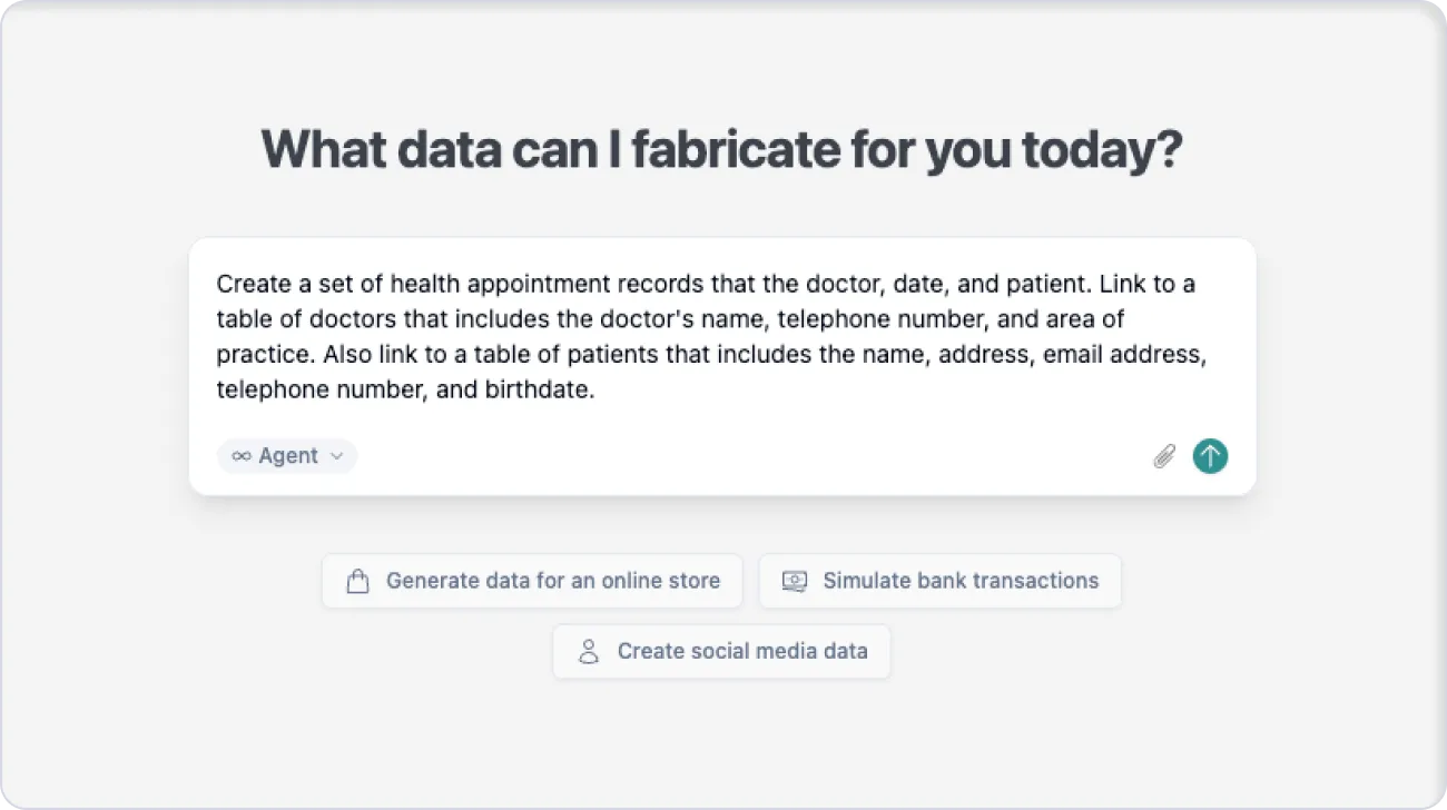 Fabricate automatically determines the right columns, data types, and realistic distributions — then generates thousands of rows in seconds. Review, tweak, or regenerate on the fly.