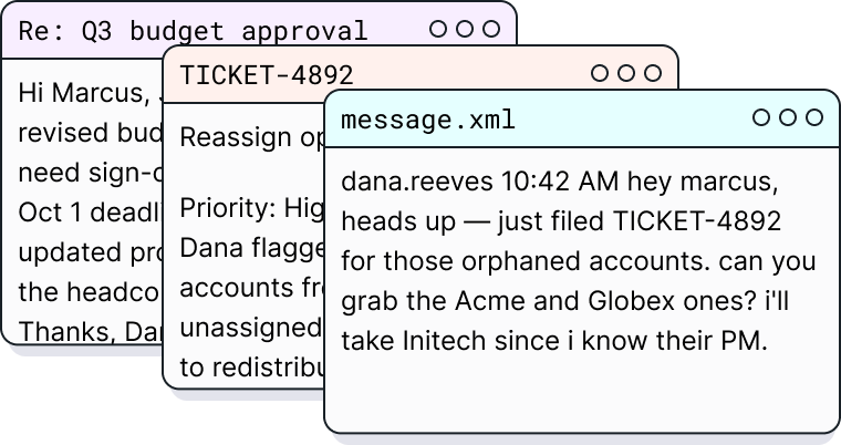 From the structured foundation, Fabricate produces the unstructured artifacts your agent actually sees — emails, messages, documents, tickets — each written in a distinct voice and grounded in the underlying data.